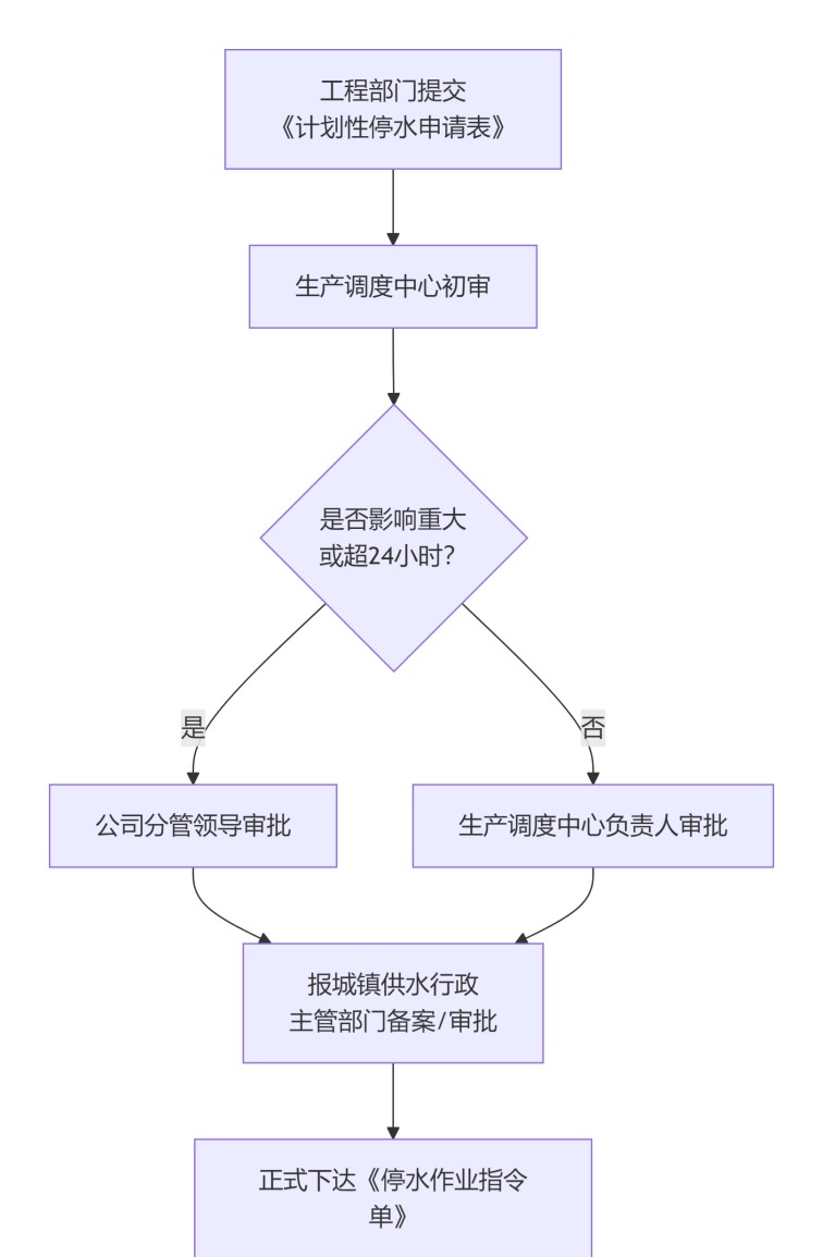 內(nèi)部審批:調(diào)度中心對停水的必要性、時長和范圍進行初審。影響范圍廣或停水時間預計超過24小時的重大作業(yè),需報公司分管領(lǐng)導批準。